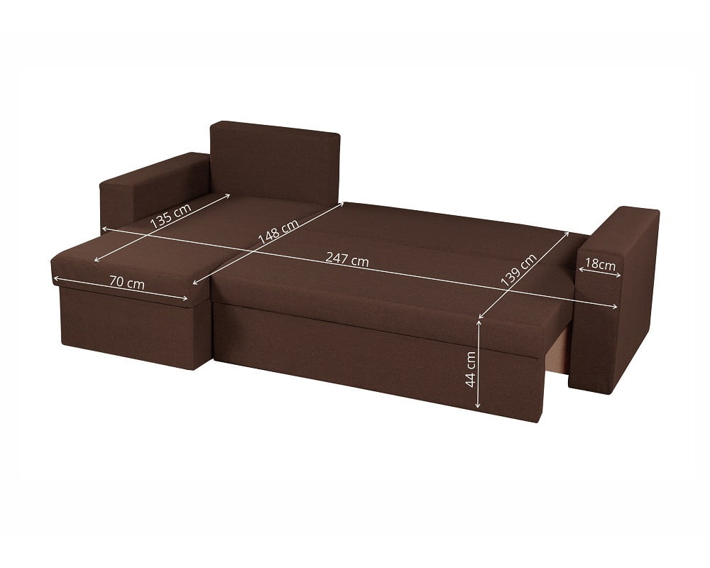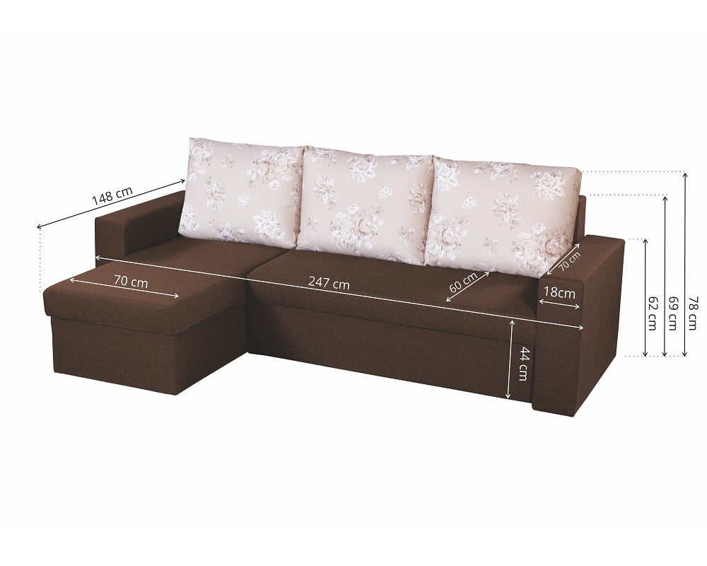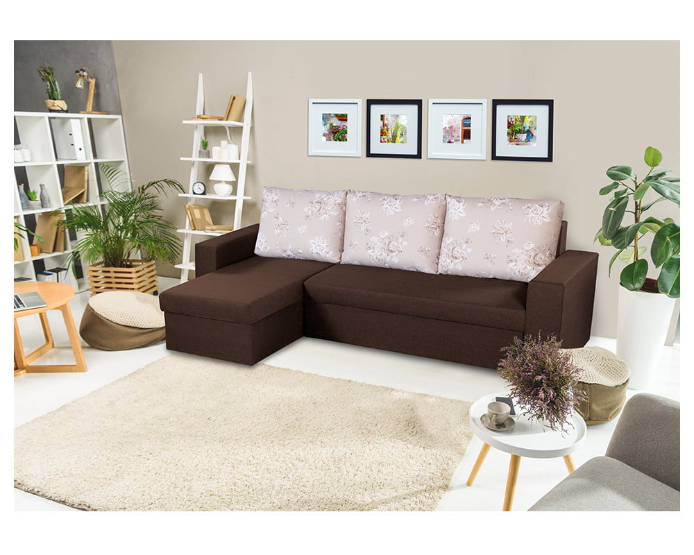 Az Oslo kihúzható sarokülő könnyen illeszkedik lakásának bármely szobájába, legyen az nappali vagy hálószoba. Az egyszerű vonalaknak és az ideális méreteknek köszönhetően az Oslo kihúzható sarokülő könnyen átalakítható kényelmes és tágas ággyá az éjszakai pihenéshez. Ez a kihúzható sarokülő barna anyaggal, semleges árnyalattal van kárpitozva, ami modern hangulatot teremt, valamint elegáns virágpárnát kínál. A sarokülő méretei ideálisak minden helyiséghez, legyen az kisebb, agy nagyobb, lehetővé téve a maximális hatékonyságot az otthoni hely optimalizálásában. A 2 tárolódoboz segít különféle tartozékok és tárgyak tárolásában és rendszerezésében, hozzájárulva a környezeti tér javításához. Az összecsukott állapotban is alkalmas pihenésre vagy akár alvásra, 211×139 cm méretű felületet kínálva. Szoros változatban az OSLO sarok 247 cm hosszú karokkal, 211 cm karok nélkül, 78 cm teljes magassággal, 44 cm ülőmagassággal, 60 cm ülőmélységgel párnákkal és 70 cm ülőmélységgel párnák nélkül. A mellékelt 3 párna támaszt és kényelmet biztosít. Ennek a kanapénak az ülése habszivacs és szinuszos rugós hálóval van ellátva, a szerkezet pedig fakeretre készült, ami ellenállást és tartósságot biztosít. Fontos előny, hogy az OSLO sarokülő megfordítható.