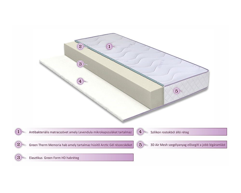 A puha szilikonrostos és levendula illóolajokkal rendelkező szövet a felső felén 2 cm-es Green Therm Memory HD® memóriahabos Arctic Gél® hideg részecskés habbal párnázott. Ez a kényelmi réteg reagál a test melegére és hozzásimul ehhez, kiküszöbölve a nyomási pontokat az alvás ideje alatt az izmok pihentetése érdekében, megfelelő vérkeringést biztosítva. A stressz és a szorongás elleni küzdelemben segítenek a levendula illóolajos kapszulák, de segíthetnek az álmatlanság és a depressziós állapotok kezelésében is. A levendula gyakran használt a stressz vagy szorongás elleni kezelésekben. Az antibakteriális és gyulladásgátló tulajdonságok mellett a kutatók felfedezték, hogy a levendula segít a relaxációban. A memóriahabos kényelmi rétegben lévő hideg gél részecskéi a levendula illóolajokkal együtt segít a túlzott hőmérséklet csökkentésében és az optimális termikus kényelem elérésében az alvás ideje alatt.
